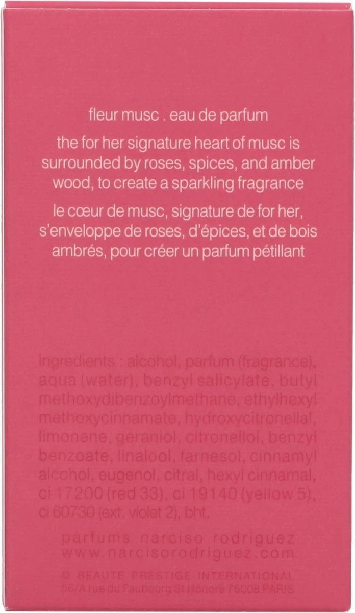 Fleur Musc van Narciso Rodriguez is een sprankelende geur. De hartnoot van muskus wordt omringd door rozen en kruiden. Een bloemig parfum met een puur hart. Het parfum is gecreëerd door Calice Becker en Sonia Constant .